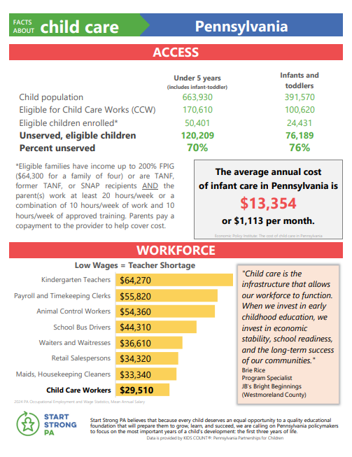In Pennsylvania the price of child care is high and a burden for most families, while child care programs operate on razor-thin margins and child care teachers and staff are paid poverty level wages. Parents can’t afford to pay more and providers can’t afford to be paid less. Pennsylvania’s payment rates to programs for children in Child Care Works do not cover the actual cost of care provided by programs.
