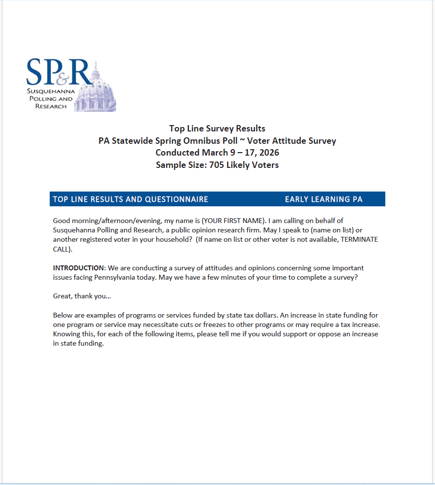 According to a poll commissioned by the Early Learning PA Coalition and conducted by Susquehanna Polling and Research from March 9 -March 17, 2026, PA voters believe that early childhood education is important.