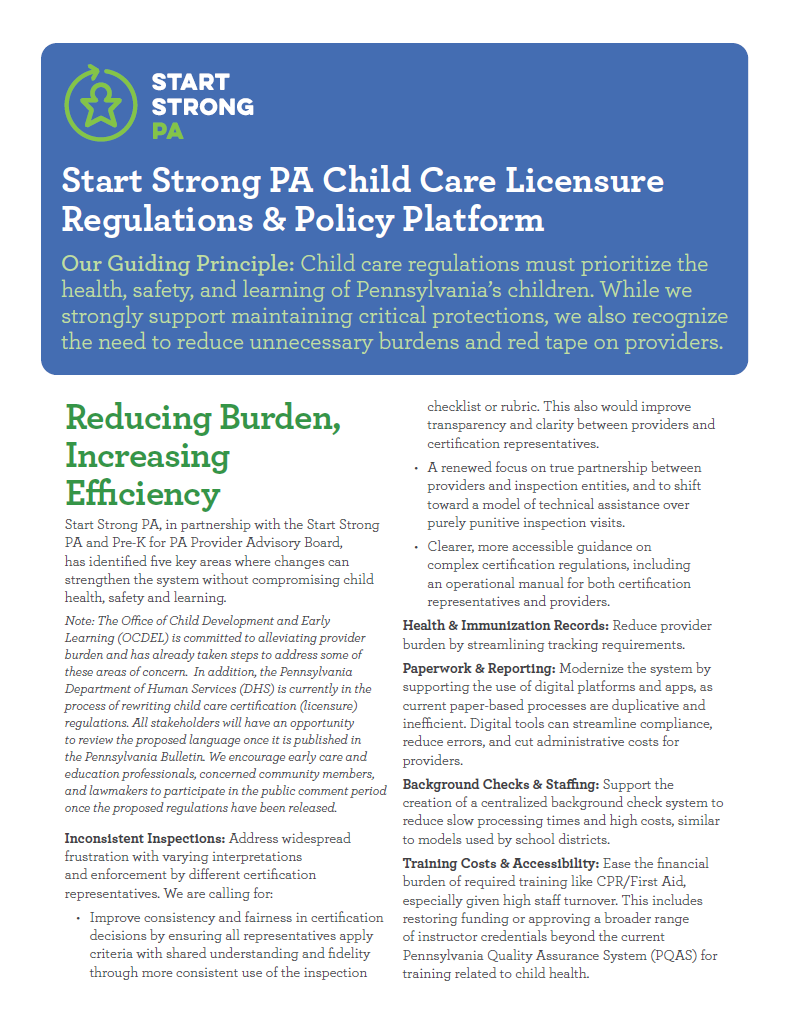 Start Strong PA Child Care Licensure Regulations & Policy Platform